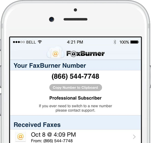 Receive faxes on your iPhone - up to 25 pages/month free! A temporary fax number is provided for instant use, and all received faxes are delivered directly to your app or email inbox.